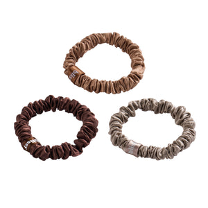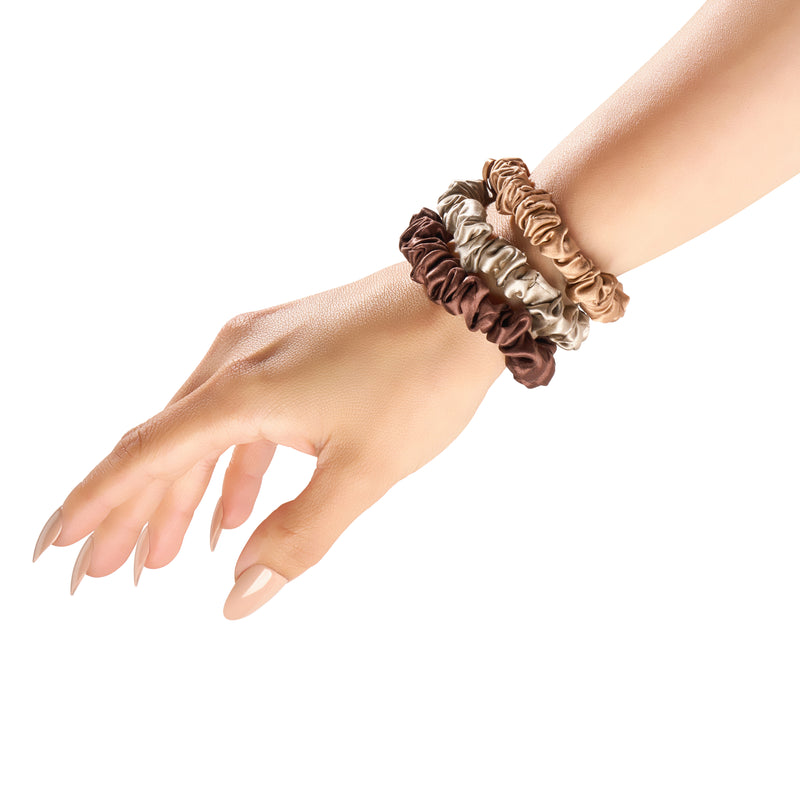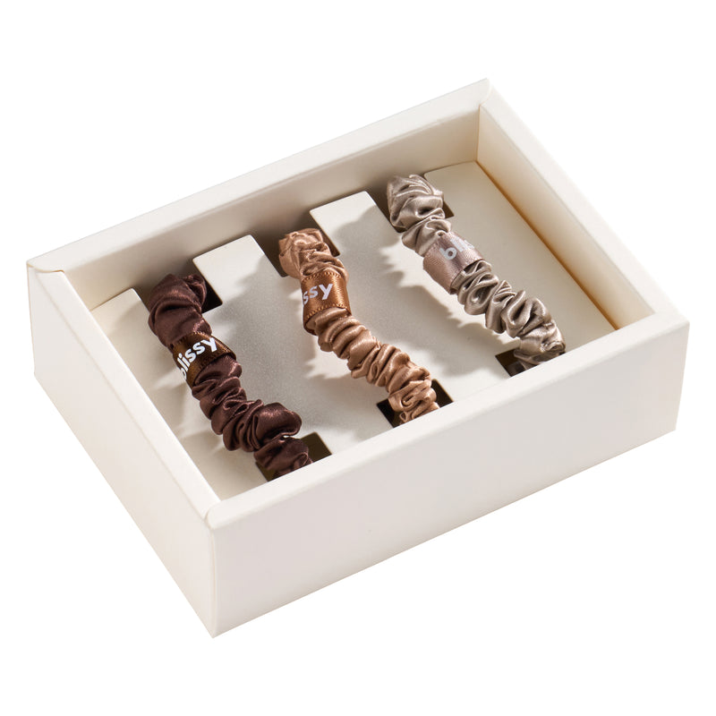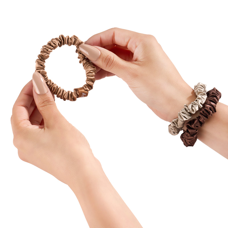 Ditch the creases, breakage, and frizz—Blissy Skinny Scrunchies are made from 100% pure mulberry silk to protect your hair while keeping it in place. Unlike traditional hair ties, our silk scrunchies glide over strands without pulling or snagging.